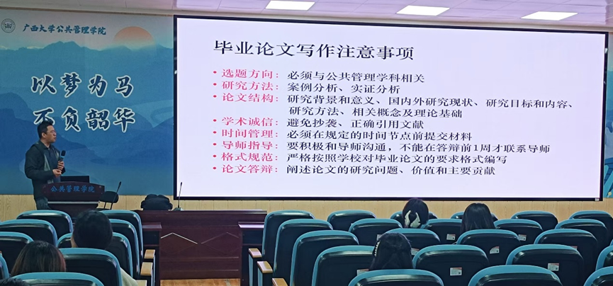 针对毕业生普遍关心的“如何写好毕业论文”,陈璟浩老师就选题方向、研究方法、论文结构等论文写作注意事项进行了细致的讲述。在选题与方法上,他强调选题必须紧扣公共管理学科属性,鼓励聚焦学科前沿与社会热点议题,采用案例分析、实证分析等研究方法进行论证;在学术规范与文献引用方面,他指出“高质量输入决定高质量输出”,建议学生优先参考近五年的文献,多参考和引用《中国行政管理》《公共管理学报》等学科内的北大核心、CSSCI高层次期刊论文,以保障毕业论文研究视野的前沿性与学术观点的严谨性。此外,他还特别强调了时间管理以及与导师沟通的重要性。提醒学生务必摆脱“拖延症”,严格设定和把控各个阶段的时间节点,定期向导师汇报研究进展,预留充足的时间提交毕业论文,切忌“压线提交”,确保导师有足够的时间进行指导与反馈。
