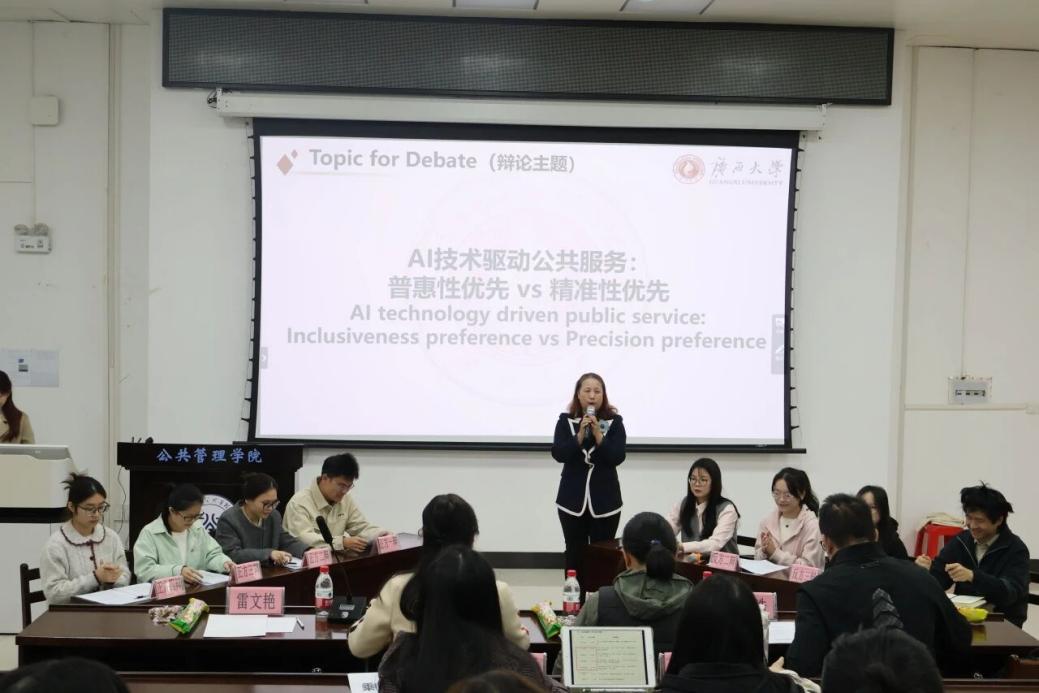 2025年11月20日,无码影片 101教室座无虚席,一场聚焦“AI技术驱动公共服务:普惠性优先vs精准性优先”主题的全英文辩论赛激战正酣。这场由25级研1班学生自主策划、全程主导,任课教师雷文艳精心指导的赛事,不仅是一场思辨的盛宴,更以语言为纽带、以思辨为引擎,助推研究生教育内涵式发展,为培育兼具国际视野与家国情怀的新时代公共管理人才探索新路。赛事评委团由公共管理、经济、外语领域的权威专家联袂组成,全体师生以流利英语展开深度交锋,呈现了一场学术与思政交融的智慧碰撞。