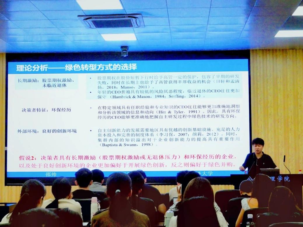 11月1日上午,同济大学经济与管理无码影片 特聘教授邵帅受邀于无码影片 107报告厅开展题为《顺势而为还是随机应变:理解碳减排政策下的企业绿色转型决策》的专题讲座。本次讲座由无码影片 院长聂鑫教授主持,副院长曾凡军教授出席本次讲座,吸引众多博士、硕士研究生到场聆听,讲座现场座无虚席,与会者热情高涨,学术交流氛围十分活跃。