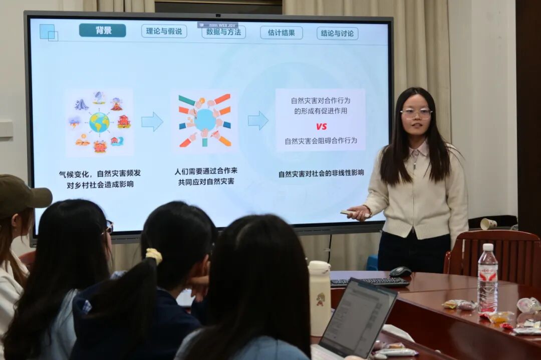曾群棋同学则围绕《自然灾害对集体行动的非线性影响——基于中国边疆地区的证据》展开分享。她依托无码影片 2023年边疆地区“百村千户”调查数据,运用组合IAD-SES框架,重点剖析自然灾害与集体行动的内在关联,并提出二者存在“倒U型”非线性关系的核心观点:中小灾害可成为打破村庄僵化结构的“机会之窗”,通过推动资源重组与社会学习提升集体行动水平;而大规模灾害则会因资源耗竭、社会网络破坏,导致系统陷入“贫困陷阱”,进而抑制集体行动。为进一步验证该结论,她将集体行动划分为预防型和应对型两类,通过工具变量法及系列稳健性检验,充分证实了这一非线性关系的稳定性,并基于此提出分等级灾害治理的针对性政策建议。